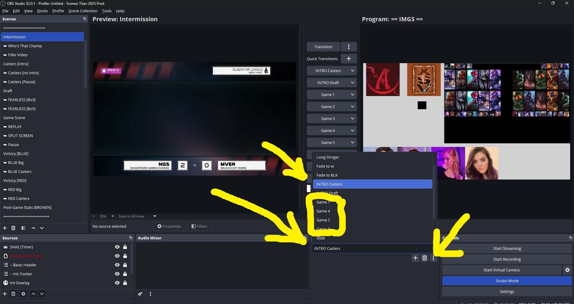The Run of Show goes like this: Intermission > Casters [intro] > Draft > Game Scene > Victory Scenes > Repeat. Here is an explanation of what to do in each scene: